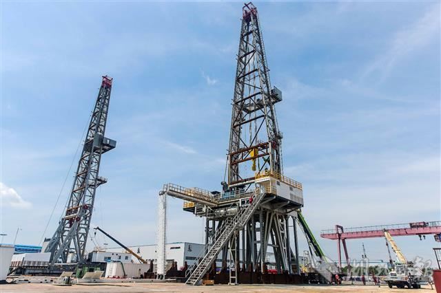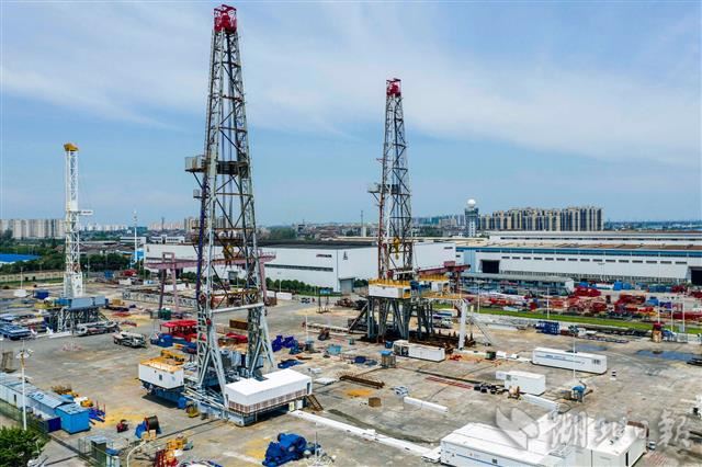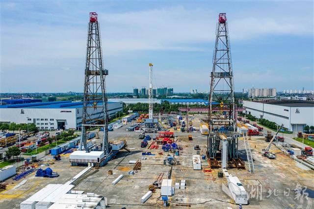 8月13日,石化机械四机公司生产的两台8000米钻机正在进行组装调试。钻机高达65米,重约500吨,将于近期发运出厂,交付新疆和国外的用户。位于荆州市的石化机械四机公司,面对今年国内外疫情影响,坚持任务不减、目标不变、标准不降,聚力国内国际两个市场,抢抓订单,严格履行合同承诺,保质保量地完成钻井重器的生产任务。